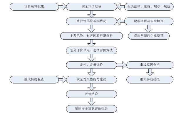 根據(jù)《安全評價通則》(AQ8001-2007),本次安全現(xiàn)狀評價程序包括:安全評價準備;被評價單位基本情況;危險、有害因素分析識別;劃分評價單元及選擇評價方法;定性、定量評價;確定安全對策措施及建議;評價結(jié)論;編制安全現(xiàn)狀評價報告。